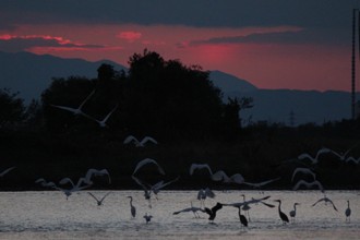 / 川,鳥,サギ,鷺,植物,建物,山,夕焼け,雲,空