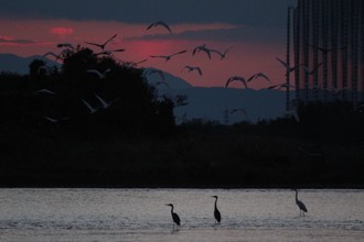 / 川,鳥,サギ,鷺,植物,山,夕焼け,雲,空,鉄塔,建物
