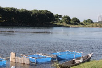 / 川,鳥,サギ,鷺,植物,木,河畔植生,建物,空,船,網