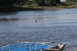/ 川,鳥,サギ,鷺,植物,木,河畔植生,船,網