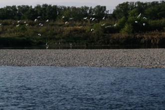 / 川,河原,鳥,サギ,鷺,植物,河畔植生,木,堤防