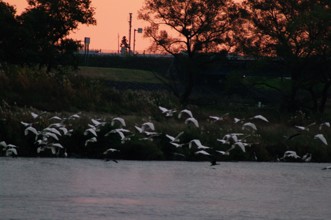 / 川,鳥,サギ,鷺,ウ,鵜,植物,木,空,ガードレール,夕焼け