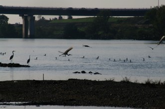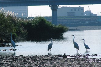 / 川,河原,岩石,堤防,車,空,鳥,鷺,サギ,鵜,ウ