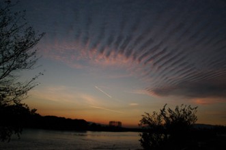 / 川,植物,木,建物,空,雲,夕焼け,空,ひこうき雲