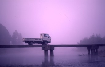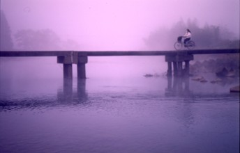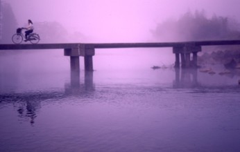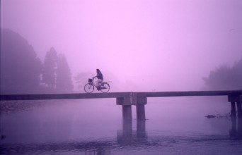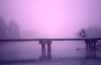 霧の沈下橋 / 自転車,傘,橋,川,竹藪,木,植物,岩石,人