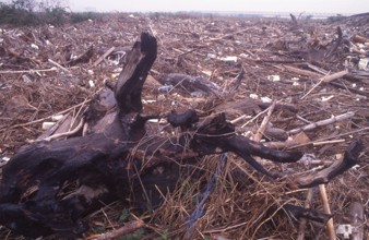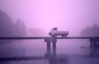 / トラック,橋,車,川,竹藪,木,植物,岩石,人