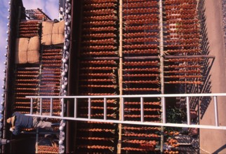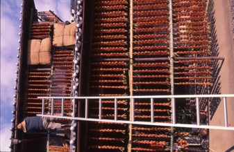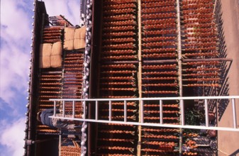 / 干し柿,はしご,家,建物,瓦,植物,人,長靴,空,雲,帽子,植木鉢