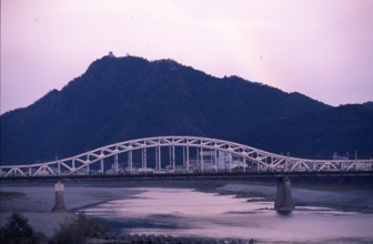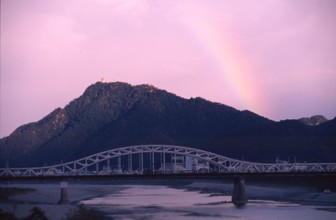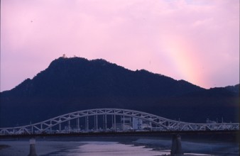 / 金華山,岐阜城,川,橋,車,バス,木,植物,建物,電柱,電線,寺,虹,空,雲