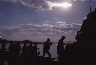 / 人,袋,帽子,橋,建物,船,眼鏡,植物,木,鉄塔,電線,山,空,雲,太陽,川
