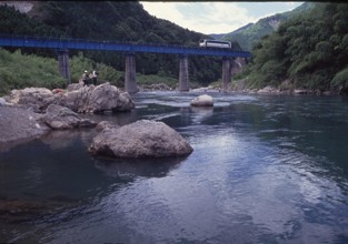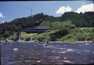 (棚瀬)船頭さん / 河畔植生,橋,長良川鉄道,電車,人,釣り,釣り人,竿,網,川,岩,山,鉄橋,釣り竿