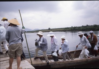 小紅の渡し / 笠,人,船,帽子,鞄,リュック,救命胴衣,川,笑顔,河原