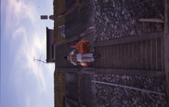 今日も一日終わり / 人,帽子,救命胴衣,建物,アンテナ,階段,長靴,カラーコーン,空,雲