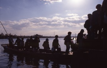 下船風景 / 人,袋,帽子,橋,建物,船,眼鏡,植物,木,鉄塔,電線,山,救命胴衣,子供,空,雲,川