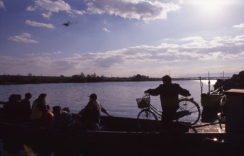 / 人,袋,帽子,橋,建物,船,植物,木,鉄塔,電線,子供,自転車,空,雲,川