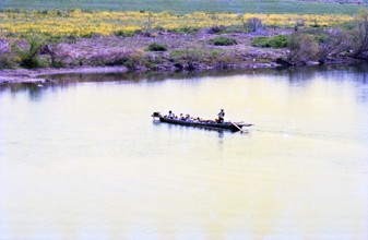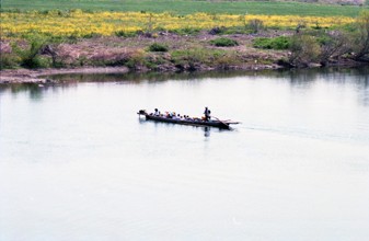 / 人,舟,帽子,子供,川,植物,河畔植生,花
