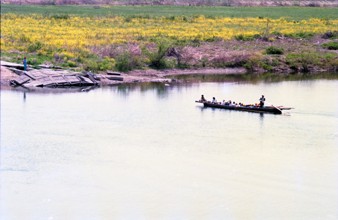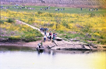 小紅の渡し・遠足 / 人,舟,帽子,子供,川,植物,河畔植生,花,階段,道