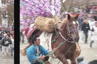 / 神社,馬,法被,祭り,人,米俵,植物,提灯,旗,手綱
