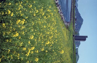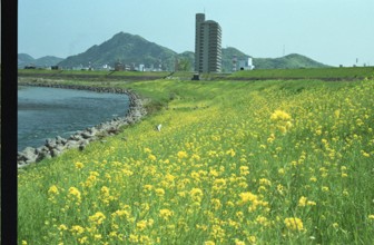 / 川、山、建物、車、植物、菜の花、河畔植生、鉄塔