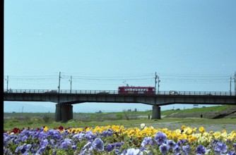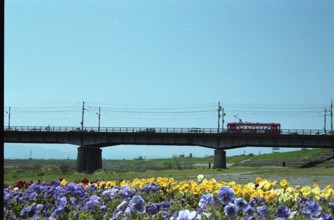 / 路面電車、花、橋、車、人、建物、標識、植物、空、電柱