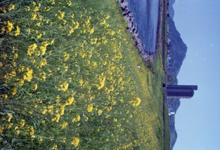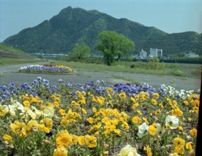 金華山遠望 / 川、山、建物、車、植物、菜の花、河畔植生、鉄塔