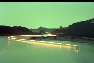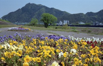 / 川、山、橋、道、植物、花、建物、車、河畔植生、金華山