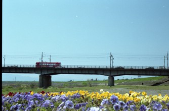 名鉄市内電車 / 路面電車、花、橋、車、人、建物、標識、植物、空、電柱