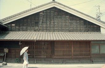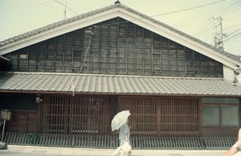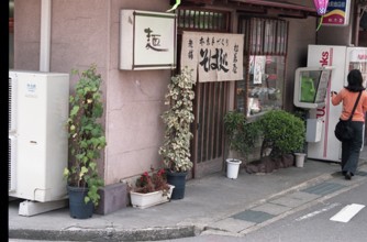 / 建物、店、蕎麦屋、自動販売機、人、公衆電話、花、植木鉢、植物、提灯