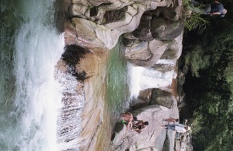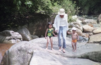 / 人,子供,帽子,岩石,植物,川,河畔植生,水着