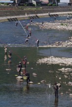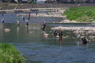 / 人,釣り,川,岩石,釣り竿,網,帽子,堤防,河畔植生,植物,建物,釣り人,鮎釣り,自転車,三脚