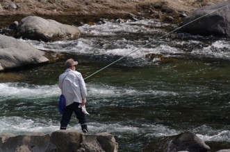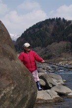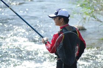 / 人,川,釣り竿,鮎釣り,網,帽子,眼鏡,植物,岩石,釣り人