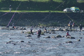 / 人,釣り,川,岩石,釣り竿,網,帽子,堤防,河畔植生,植物,釣り人,鮎釣り,テント,キャンプ