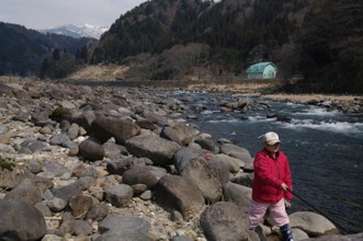 / 人,釣り竿,釣り人,帽子,鮎釣り,川,岩石,山,植物,河畔植生,堤防,雪山,電柱,長靴,木