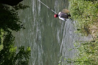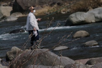 / 人,釣り竿,釣り人,帽子,鮎釣り,川,岩石,植物,河畔植生,網,マスク,眼鏡,サングラス,ヤナギ,柳,木