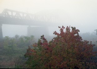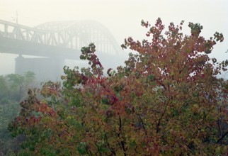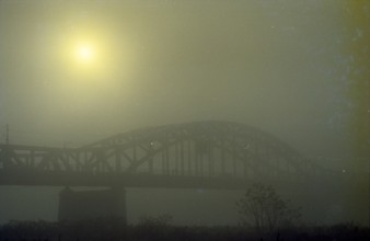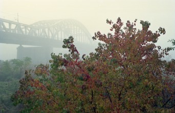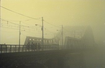 散歩・忠節橋下流 / 人,犬,橋,植物,散歩,霧