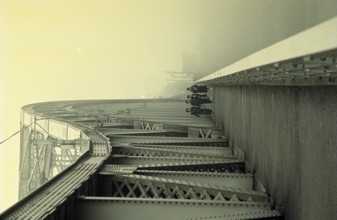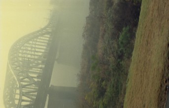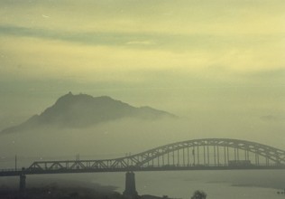 / 橋,山,金華山,車,バス,川,植物,霧,河畔植生