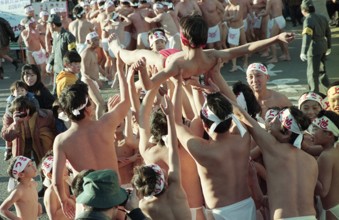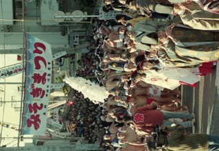裸祭り / 人,祭り,建物,標識,植物,子供,電柱,帽子,旗,屋台,ふんどし,はちまき,法被