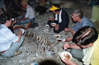 ヤナ場にて / 人,眼鏡,魚,帽子,食事,皿,炭,塩焼き,タオル,軍手