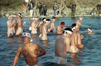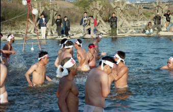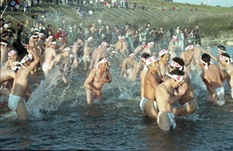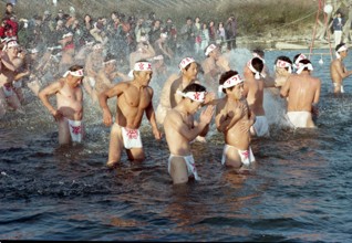 / 人,裸,ふんどし,はちまき,川,祭り,河畔植生,植物,しぶき,カメラ,帽子,眼鏡,車,旗,神主