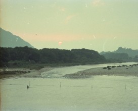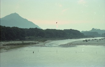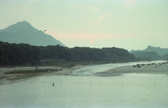 / 人,川,植物,河畔植生,山,鳥,太陽,岩石,金華山