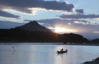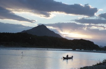 落日 / 人,川,植物,河畔植生,山,金華山,舟,旗,建物,太陽,空