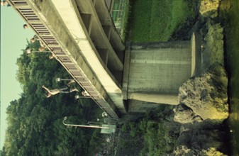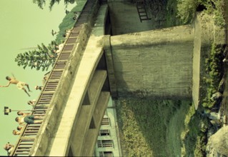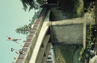 / 橋,川,人,植物,河畔植生,建物,標識,カメラ,岩石,帽子,水着,街灯