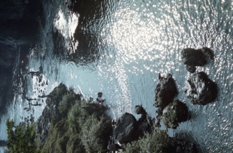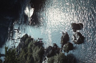 / 人,川,しぶき,岩,植物,眼鏡,煙草,水着,サンダル