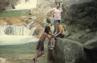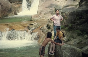 / 人,川,しぶき,岩,植物,眼鏡,煙草,水着,サンダル,笑顔