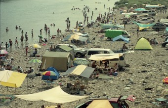 夏日・旧美濃橋~ / 人,川,テント,パラソル,植物,車,子供,夏,岩石,河川植生,浮き輪,水着,キャンプ