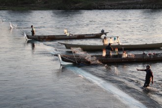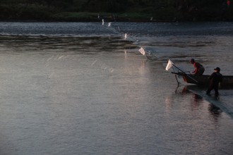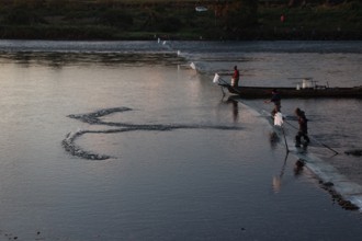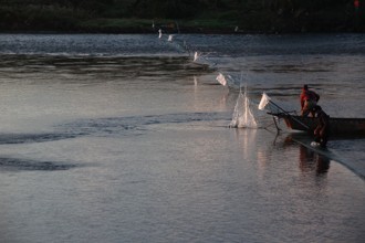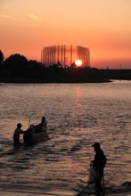 / 川,人,帽子,船,エンジン,網,植物,河畔植生,木,建物,鉄塔,鉄塔,夕日,空,夕焼け