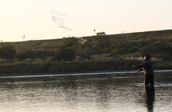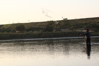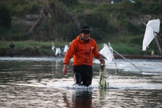 / 人,帽子,サングラス,網,魚,川,植物,河畔植生