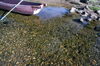 / 川,魚,川底,岩石,植物,河畔植生,船