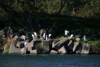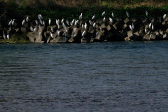 / 川,鳥,サギ,鷺,植物,河畔植生,消波ブロック
