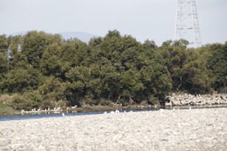 / 川,河原,消波ブロック,鳥,サギ,鷺,木,植物,河畔植生,鉄塔,山,空