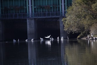 / 川,橋,鳥,鷺,サギ,木,植物,河畔植生,鵜,ウ